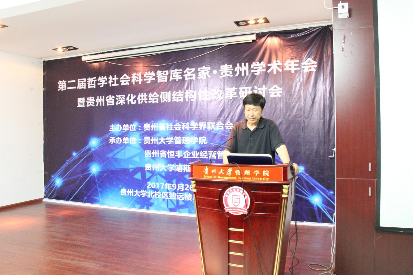 9月26日,由贵州大学管理学院、贵州省恒丰企业经营管理研究院、贵州大学喀斯特地区发展战略研究中心共同承办的第二届哲学社会科学智库名家·贵州学术年会暨贵州省深化供给侧结构性改革研讨会,在贵州大学管理学院会议室召开,贵州省社科联党组书记包御琨、贵州大学党委副书记杨未、首钢水钢集团公司党委副书记袁国雄等领导与各相关单位人员共计约130人参加了会议,贵州大学管理学院院长李烨主持了研讨会开幕式。