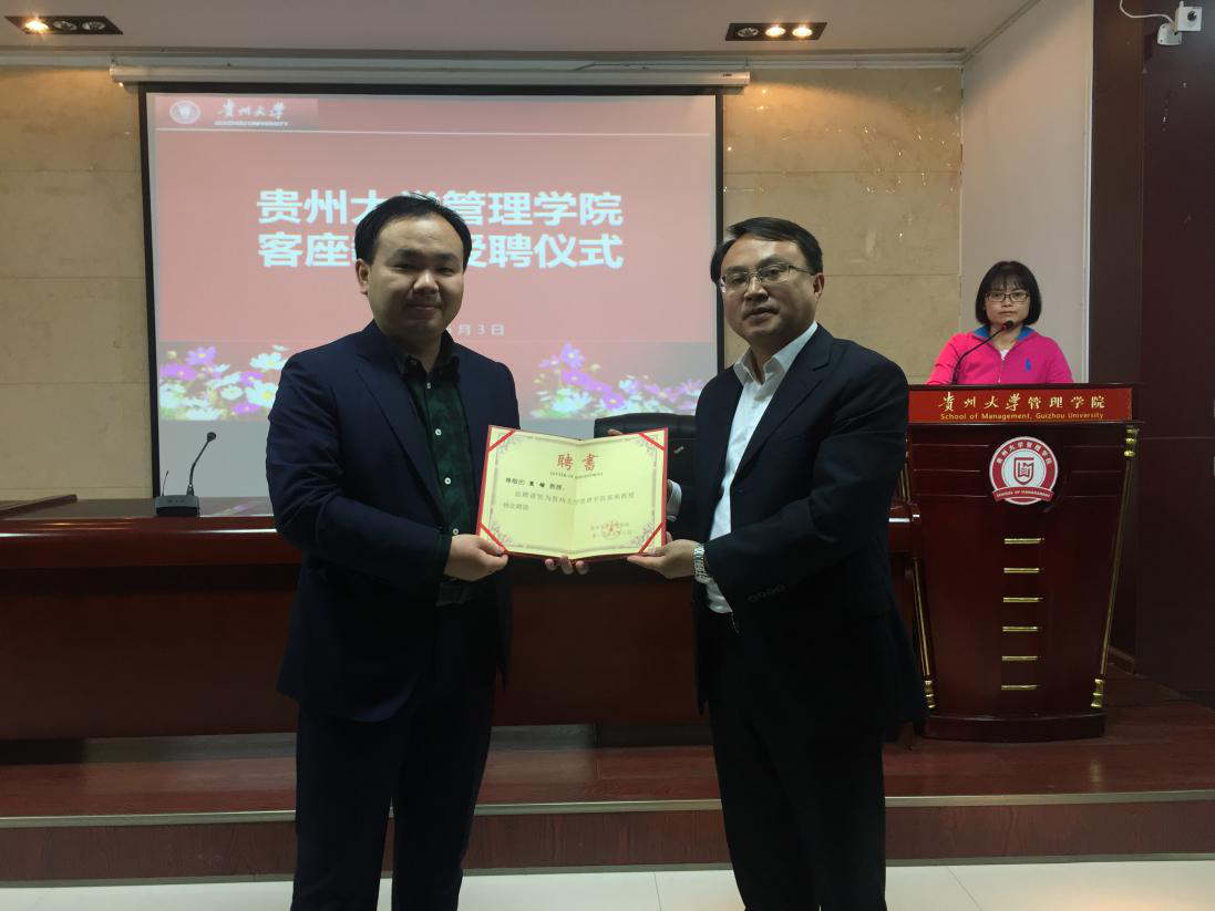 报告伊始,王婷副院长代表贵州大学管理学院正式宣布聘请熊榆教授成为贵州大学管理学院客座教授,由管理学院院长李烨教授颁发了聘书。