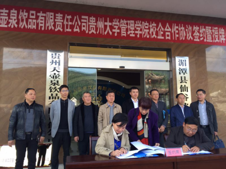 11月10日,我院与贵州天壶泉饮品有限公司在遵义市湄潭县举行校企合作框架协议签约仪式暨贵州大学管理学院本科生研究生实习基地挂牌仪式。贵州大学管理学院书记陶玉顺、副院长宋山梅、李桥兴教授、办公室主任纪雅、李会萍副教授、王云副教授、旅游与文化产业学院书记刘剑、罗阳教授等出席活动。
