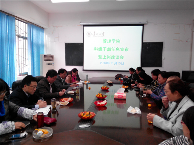2013年11月15日下午14:30,在学院二楼会议室,召开了学院科级干部任免宣布暨上岗座谈会。院党委陶玉顺书记主持会议,院长李烨,副书记于松,副院长林岚涛、王婷,及学院各科室科级干部参加了本次会议。