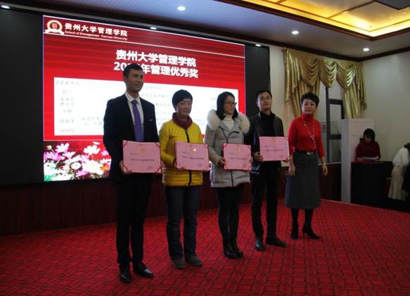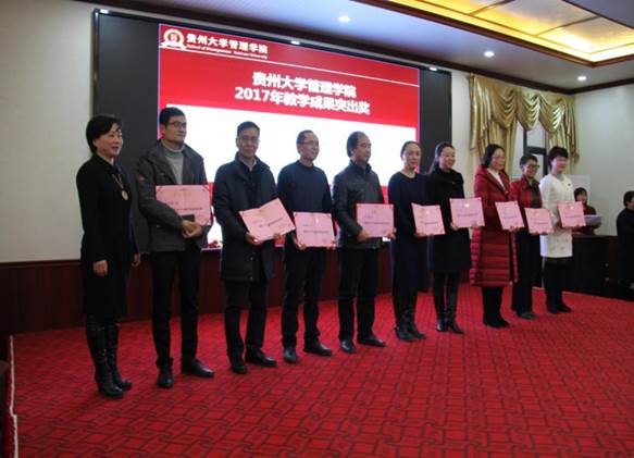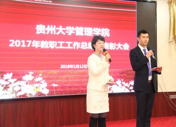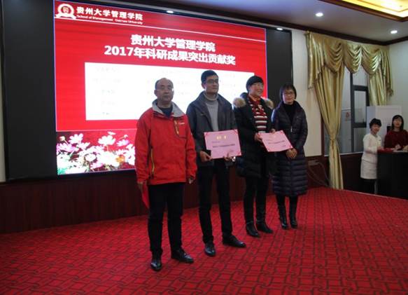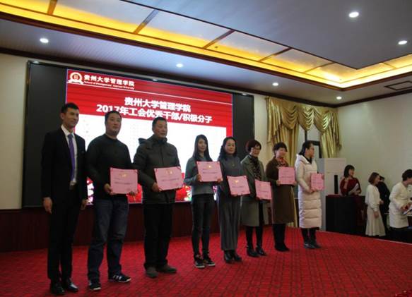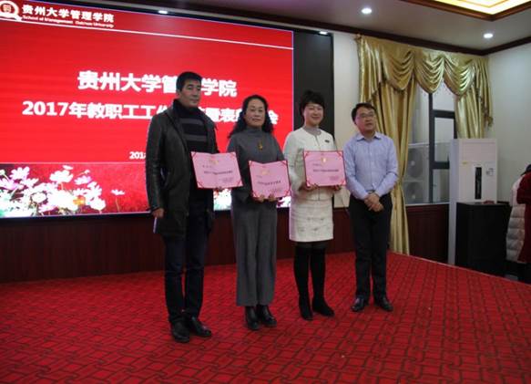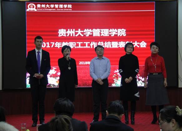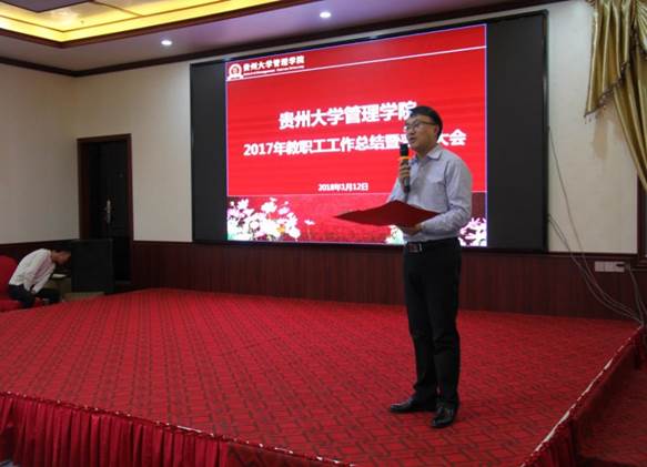 会议第二项是由李烨院长宣读《中共贵州大学管理学院委员会贵州大学管理学院关于表彰2017年优秀个人的决定》,经学院研究,决定对2017年在各项工作中表现突出的个人进行表彰,授予陶玉顺等4人学院特别贡献奖;授予杜滨等25人2017年学院教学成果突出奖;授予付江月等5人2017年学院科研成果突出贡献奖;授予徐兰等6人2017年学院管理优秀奖;授予蔡兰等4人2017年学院分工会优秀干部荣誉称号;授予纪雅等10人2017年学院分工会积极分子荣誉称号。