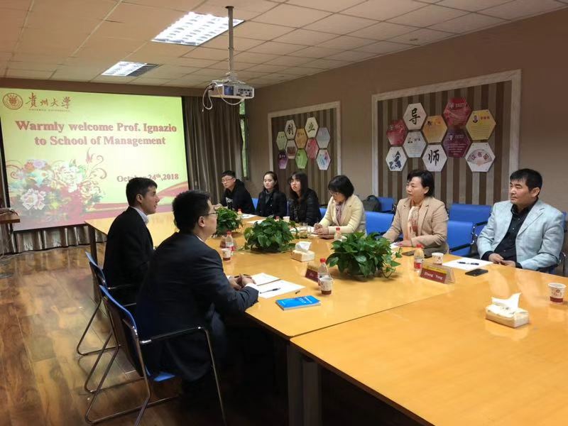2018年10月24日下午,英国诺森比亚大学Ignazio Abras教授和朱磊老师一行莅临贵州大学管理学院进行学术与项目交流访问。学院副院长王婷教授、副院长宋山梅教授、EDP中心主任张勇教授、创新创业中心主任刘遗志副教授以及汤美润老师等接待了来访外宾,双方进行了友好的洽谈。