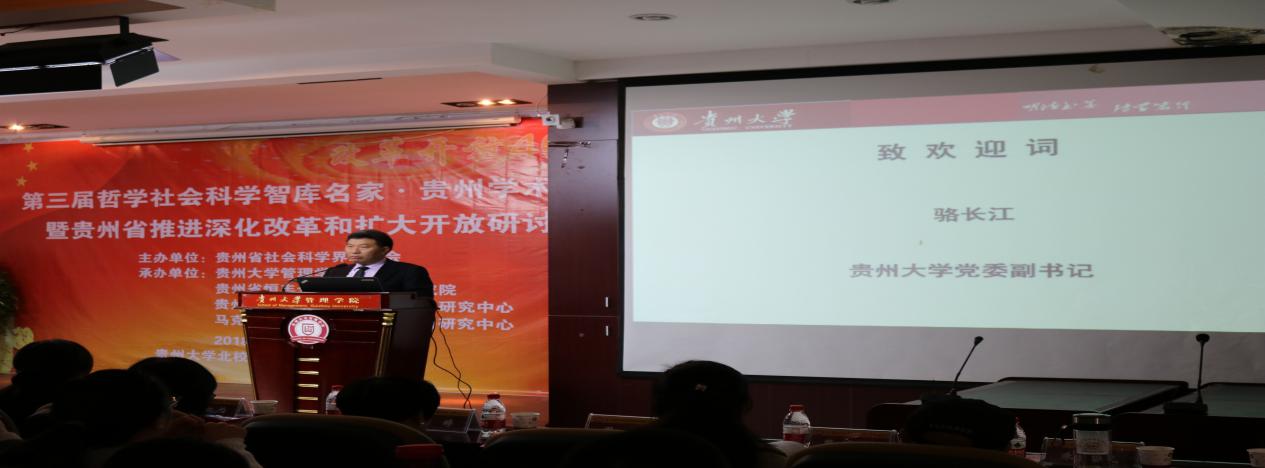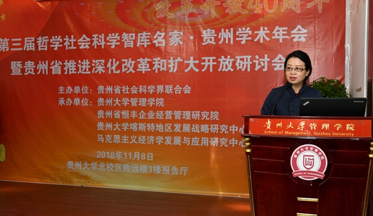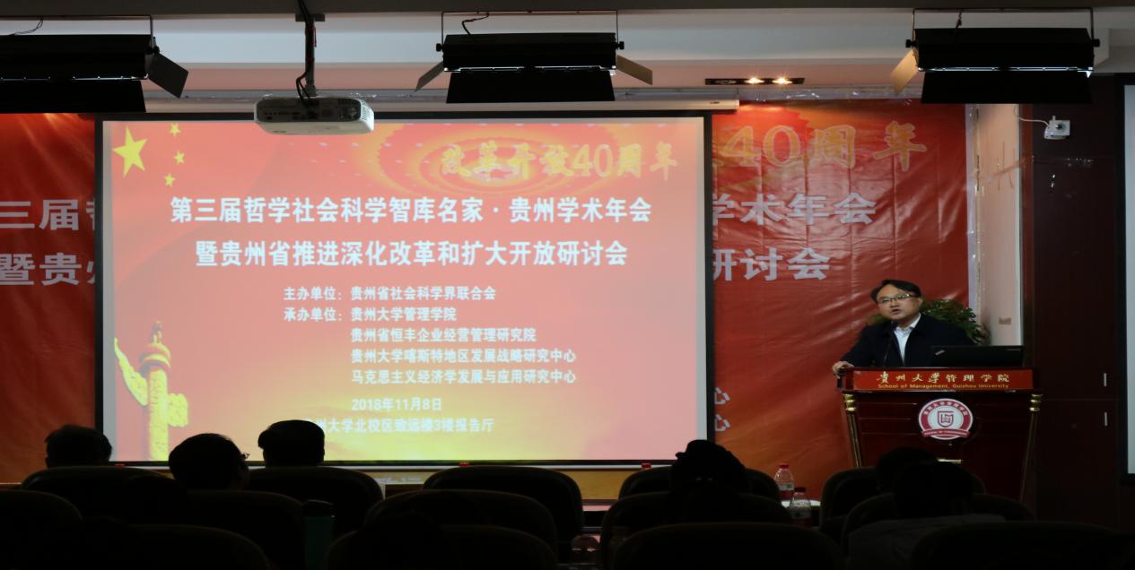 11月8日,由贵州省社会科学界联合会主办,贵州大学管理学院、贵州省恒丰企业经营管理研究院、贵州大学喀斯特地区发展战略研究中心、马克思主义经济学发展与应用研究中心联合承办的第三届哲学社会科学智库名家•贵州学术年会暨贵州省推进深化改革和扩大开放研讨会,在贵州大学北校区致远楼3楼报告厅隆重举行,来自全省社科界的专家学者和相关政府与企业的代表及贵州大学师生等150余人参加了会议。