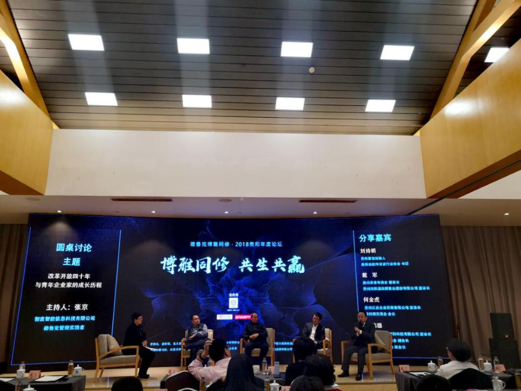 年会最后,贵州惠智创始人、贵州省软件开发行业协会书记刘诗明,贵州大学校友总会管理学院分会执行会长、贵州省青年商会理事长、贵州国际酒类博览会股份有限公司董事长戴军,贵州红谷企业管理有限公司董事长、四川南充商会会长何金虎,贵州聚和顺新材料科技有限公司董事长、中共贵州省厦门商会党支部书记陈伟雄,以“改革开放四十年与青年企业家的成长历程”为主题展开圆桌对话,分享了各自的观点和看法。