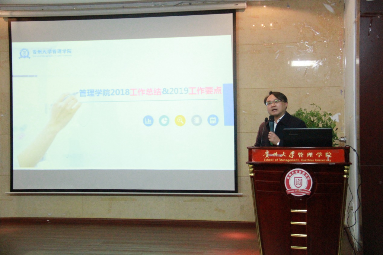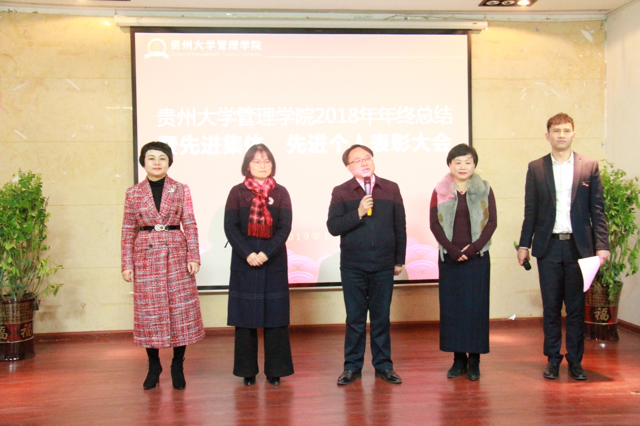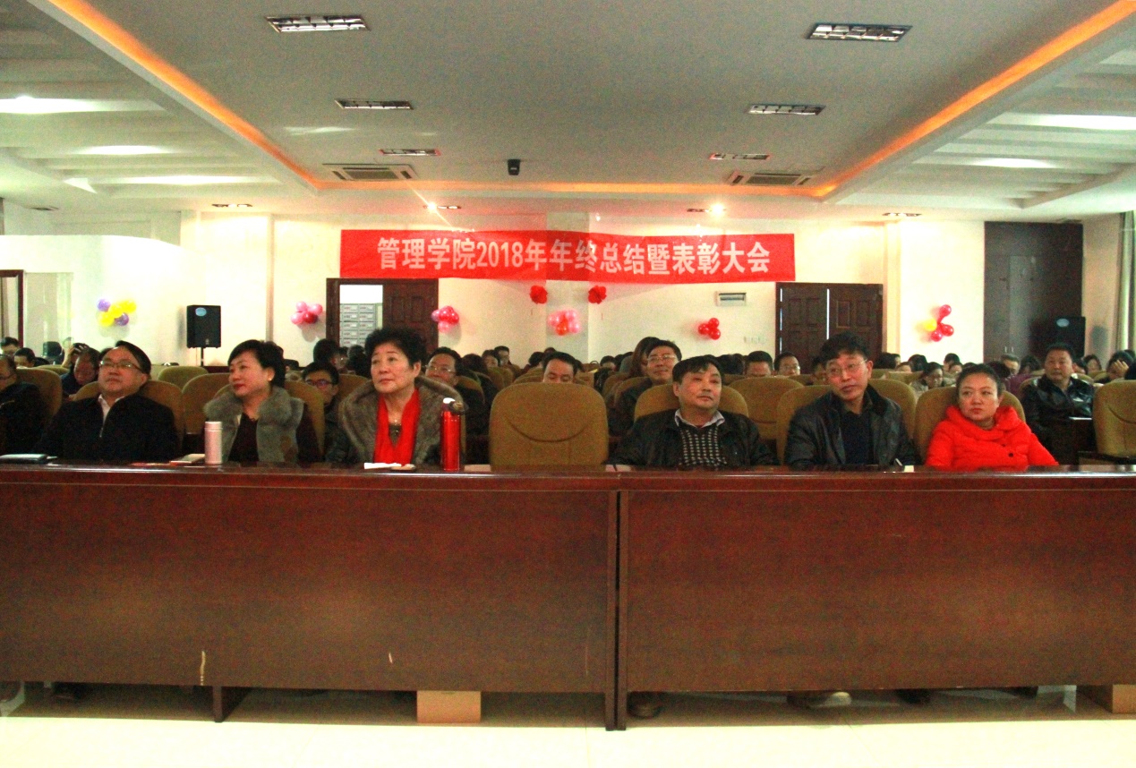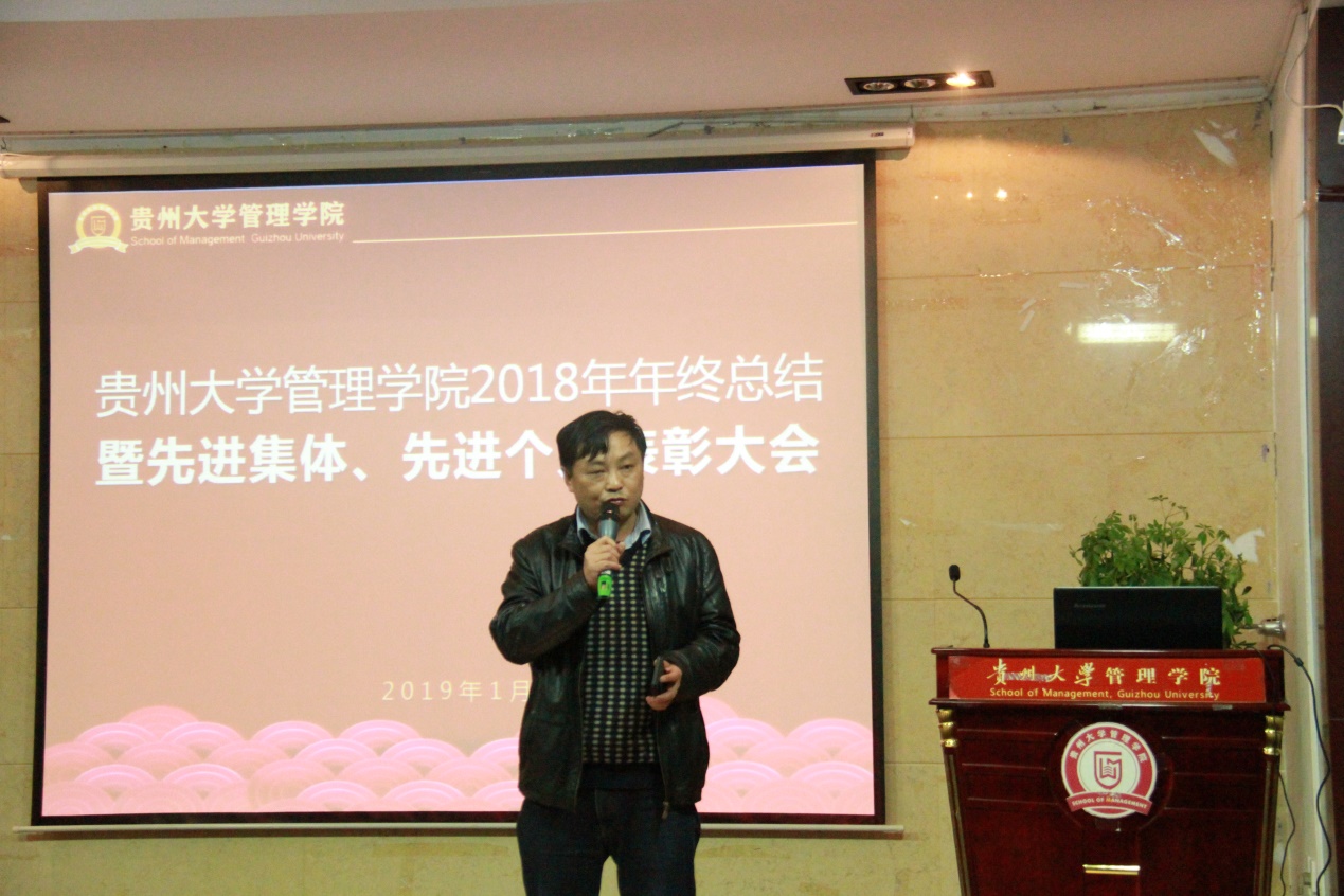 1月11日中午12点50分,贵州大学管理学院2018年年终总结暨先进集体、先进个人表彰大会于管院三楼报告厅隆重举行。贵州大学哲学社会科学研究院院长洪名勇教授;财务处王斌处长;资产管理处周昌洪副处长;法学院党委副书记、原管理学院副处级组织员洪影秋副教授;对外合作处副处长周乐欣副教授;校督导团李景勃老师以及管理学院近五年退休的各位老师出席本次表彰大会的嘉宾,贵州大学管理学院院长李烨教授;学院副院长王婷教授、周莉莉教授、宋山梅教授以及学院党委副书记张亚军老师出席本次表彰大会,管理学院全体老师参加此次表彰大会,大会由张亚军副书记主持展开。