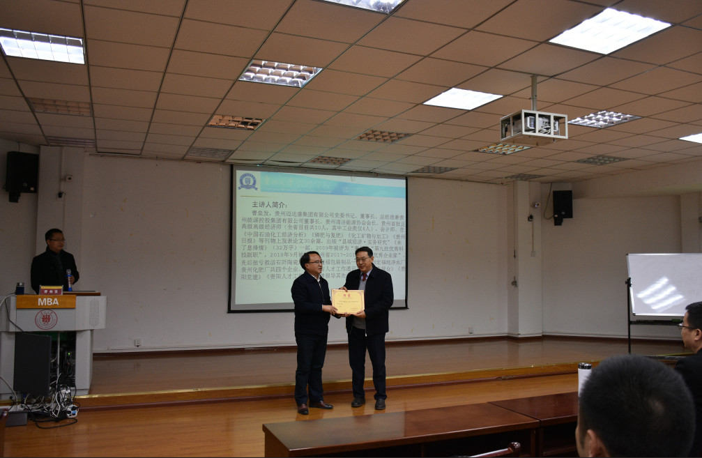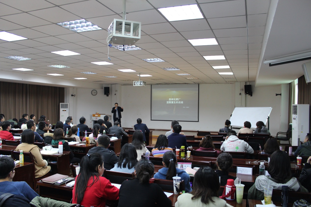 曹垒发董事长为贵州大学管理学院MBA学生开讲了《贵州化肥厂涅槃重生的启迪》的真实案例,分享了贵州化肥厂改制的艰辛和转型到能源行业五年来的成功及经验。课后在互动环节回答了学生们提出的有关问题。