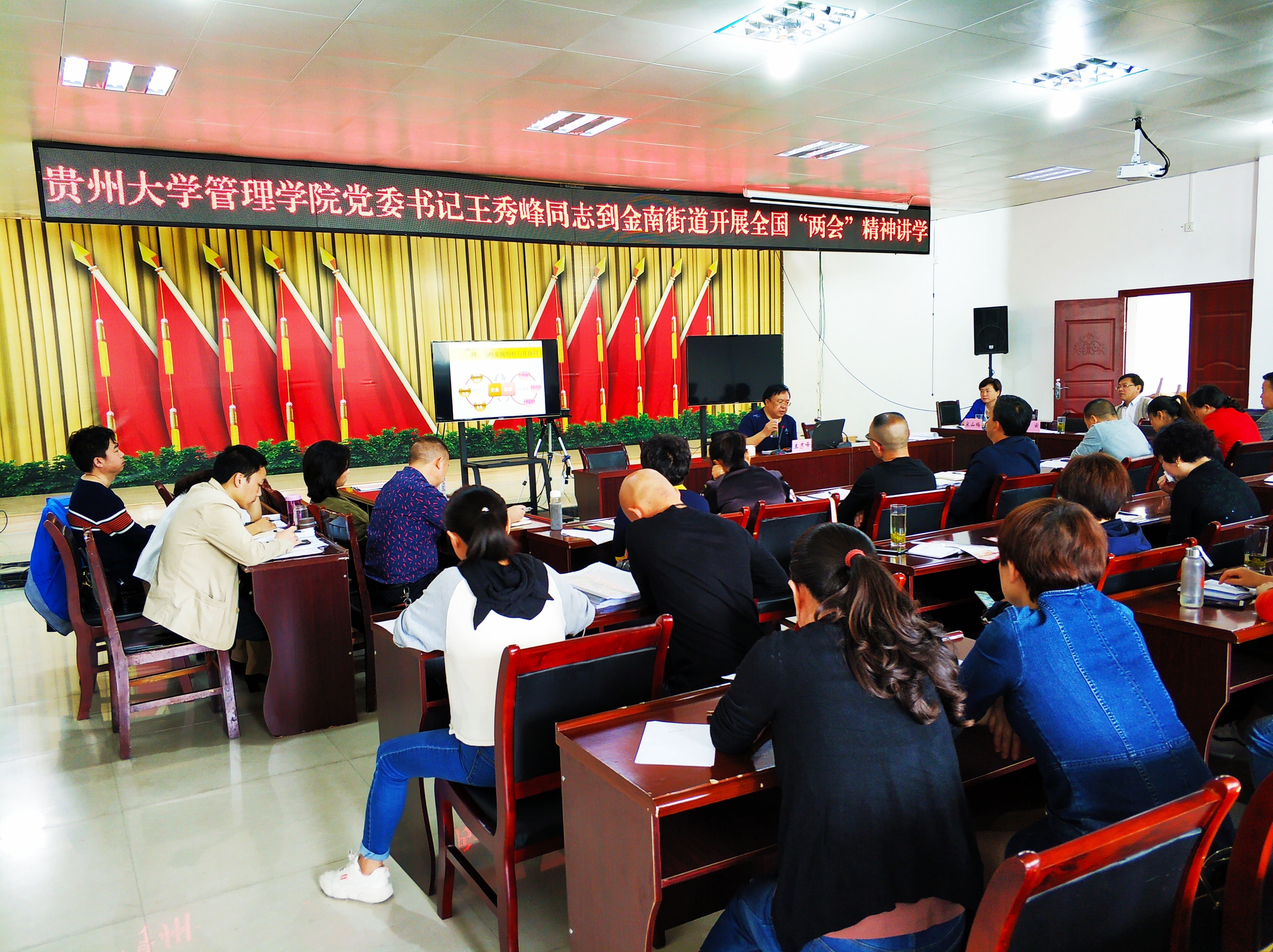 2019年4月20日贵州大学管理学院党委书记王秀峰教授应贵定县金南街道办事处基层党委邀请为贵定县乡镇干部作“发挥优势、抓住机遇、实施乡村振兴战略、打好扶贫攻坚战”的主题讲座,管理学院副院长宋山梅教授、对外合作办公室主任王云副教授及营销系高波教授参加了此次活动。。