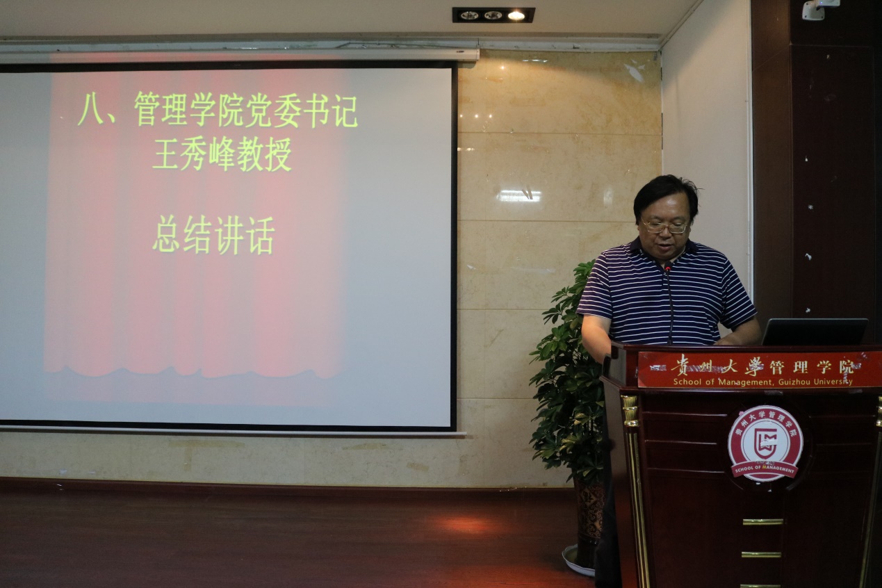 最后,学院党委书记王秀峰教授总结讲话,他再次祝贺受表彰的先进集体及个人,祝福全体毕业生。王书记还讲到,回顾党的98年光辉历程,我们感到自豪,展望未来,我们充满信心,在党的正确领导下,贵州大学管理学院的明天将会越来越好。