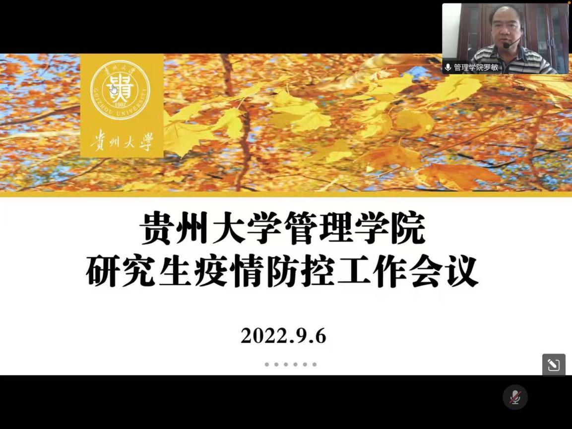 近日,贵阳市疫情突发,贵州大学迅速展开疫情防控工作。为进一步强化学生防疫意识,引导研究生骨干积极参与疫情防控工作,9月6日中午13:30,贵州大学管理学院线上召开“研究生疫情防控工作会议”,会议由管理学院副院长罗敏主持,研究生兼职辅导员龚潇潇博士及学院研究生党员、班干部、各学生组织成员共100余人参加会议。