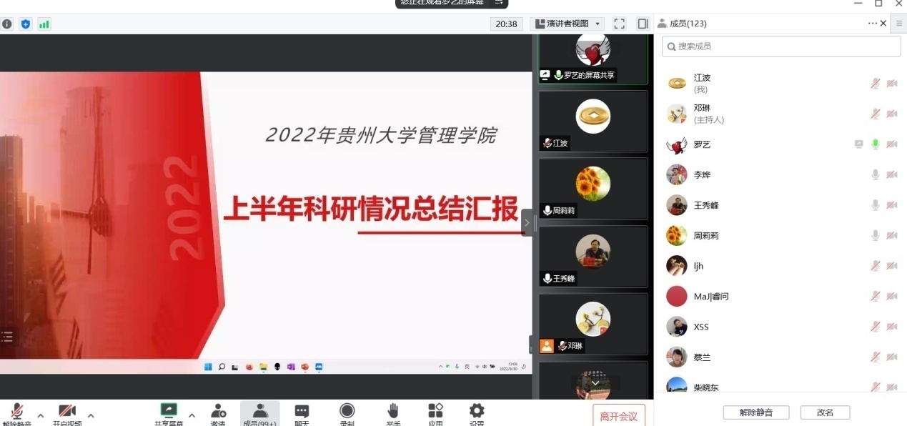 院学科办作上半年学院科研工作总结汇报,从科研项目、论文发表和服务社会作等方面了介绍。副院长罗敏作补充,他指出,上半年学院科研工作成绩喜人,国家基金立项获批创新高,超额完成学校年初下达的项目科研任务,标志着我院科研创新能力进一步提升。同时,他还对下半年学院科研工作计划作了详细介绍,号召广大教师积极做好新一轮国家基金等项目的申报工作。