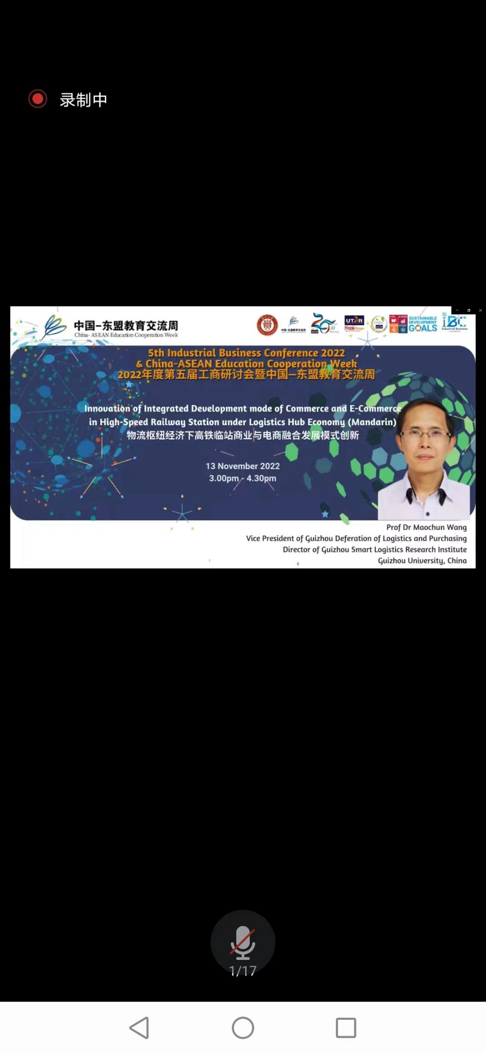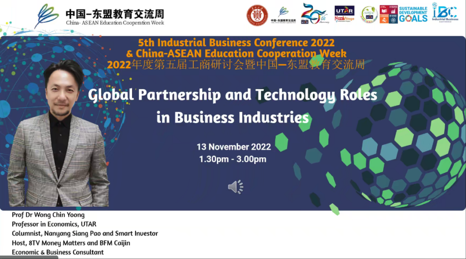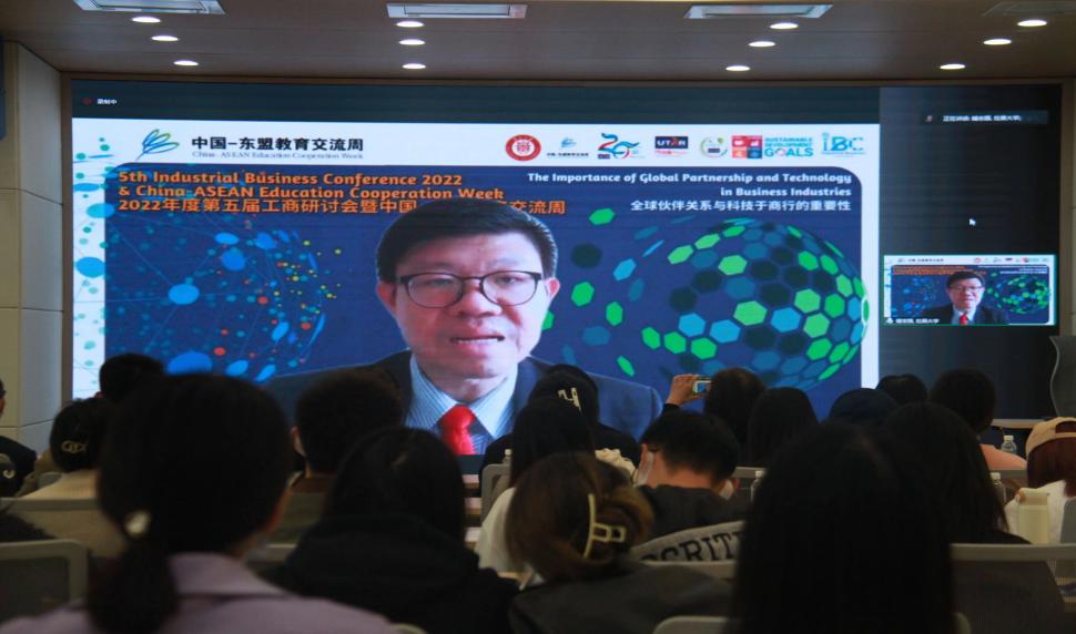 拉曼大学副校长钟志强为开幕式致辞。他鼓励支持两国学生进行交换留学、开展学术交流专题分享等活动,体验一方历史、一方风情,使留学生生活更加丰富而充实。同时强调学生要开拓视野,加强文化交流。随后他指出,本次研讨会将围绕商业、全球伙伴关系以及科技方面等相关课题进行,通过主讲嘉宾和相关专家的分享,了解国际形势,做到与时俱进、知行合一。最后,期待两校师生能够早日恢复线下探访和学习交流合作。