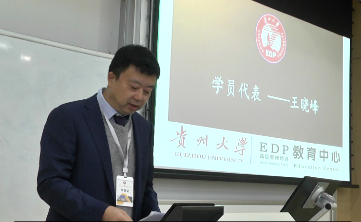 贵州省乡村振兴局处长王晓峰作为学员代表发言时表示:我们将会严格按校规校纪和教学计划认真执行并抓好落实,用足用好每一天每一课,结合自己特长和岗位工作需要,努力在各门课程上深思细读,潜心钻研,大量获取新知识、新信息、新理念。总之,既来之则安之,静下心来,团结协作,认真研读,消化吸纳,相互切磋,共同提高!