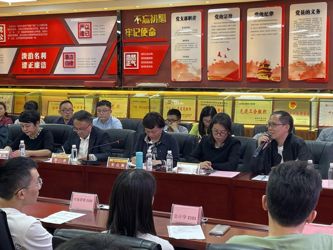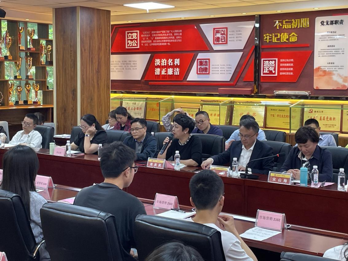 2023年5月16日,贵州大学管理学院在三楼陈列室召开了2022-2023学年第二学期本科期中教学检查学生座谈会。会议由分管本科教学的宋山梅副院长主持,李烨院长、周莉莉副书记(主持工作)、李本光副院长(正处级)、邓琳副书记、教学科老师、学生科老师及24名2019级、2020级、2021级学生代表参加了座谈会。