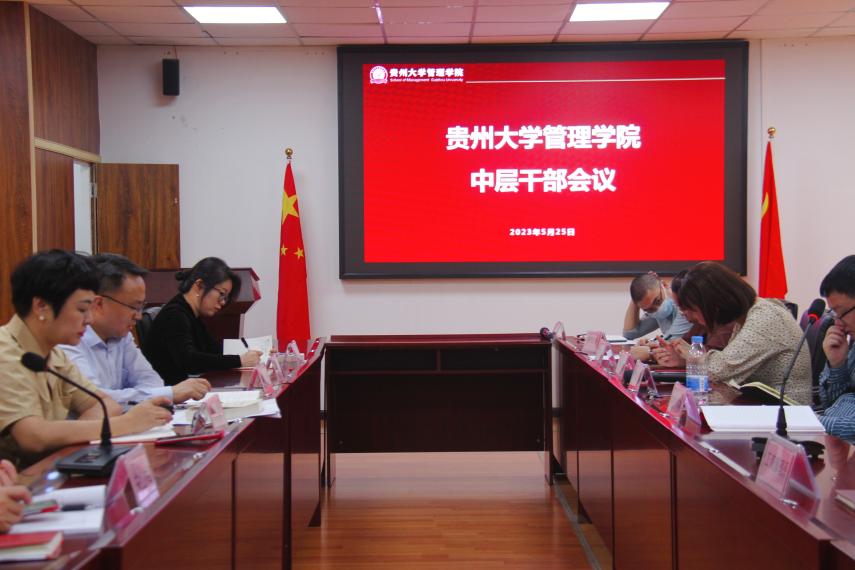 2023525日上午,贵州大学管理学院中层干部会议在东校区致远楼三楼陈列室举行。学院党政领导及各科室(中心)负责人等中层干部参加会议。会议由贵州大学党委正处级组织员、管理学院党委副书记(主持党委工作)周莉莉主持。