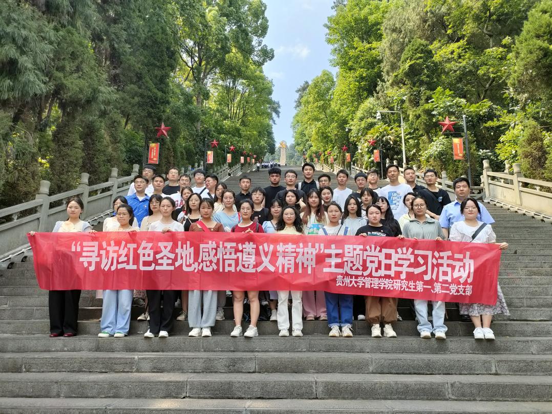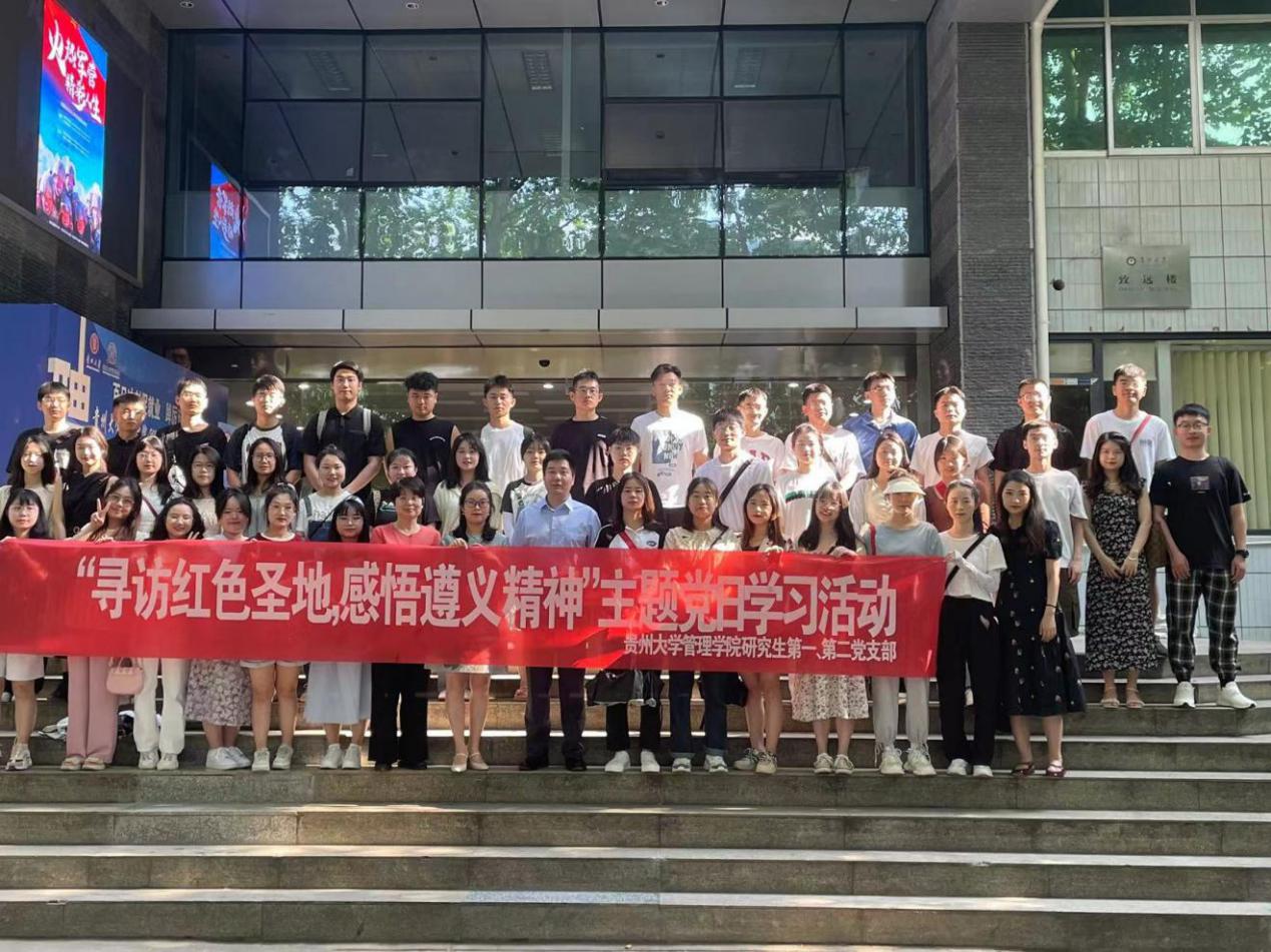 深入学习贯彻习近平总书记在“学习贯彻习近平新时代中国特色社会主义思想主题教育工作会议”中的重要讲话精神,牢牢把握“学思想、强党性、重实践、建新功”的总要求,2023年5月31日,在学院党委的组织下,贵州大学管理学院研究生第一、第二党支部赴遵义市开展了“学习贯彻习近平新时代中国特色社会主义思想主题教育暨‘寻访红色圣地 感悟遵义精神’”主题党日学习活动,通过对革命先烈的缅怀,了解革命先辈们浴血奋斗的感人事迹,接受革命精神的洗礼、传承红色基因、厚植红色文化,进一步提高研究生党员的爱国热情,将“不怕苦不怕累,敢为天下先”的伟大革命精神发扬传承下去。