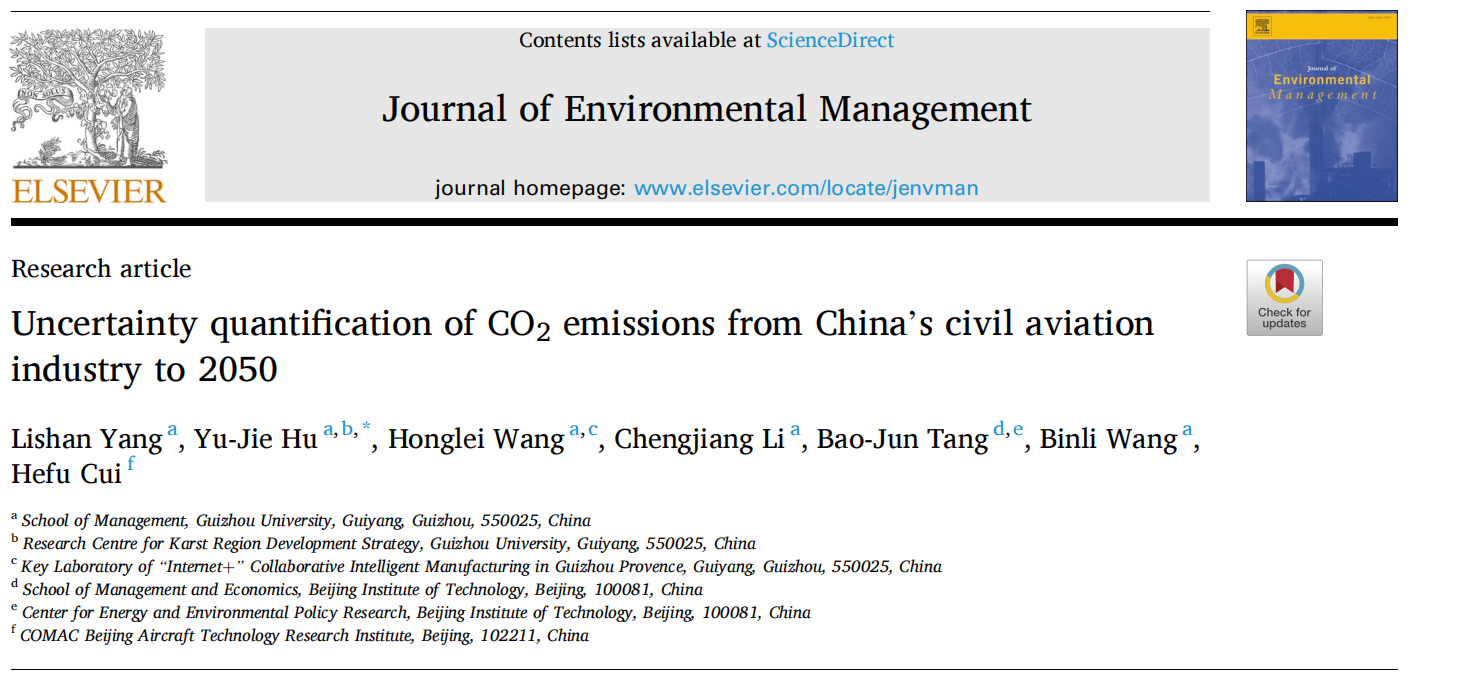 2023年6月9日获悉,我院胡玉杰副教授及其指导的2021级管理科学与工程学术型研究生杨莉杉围绕双碳背景下的中国民航业碳减排路径研究取得阶段性进展,研究成果《Uncertainty quantification of CO2 emissions from China’s civil aviation industry to 2050》在国际权威期刊《Journal of Environmental Management》上在线发表,贵州大学管理学院为第一署名单位。这是贵州省致力于民航业双碳研究领域的首篇高质量高水平论文。