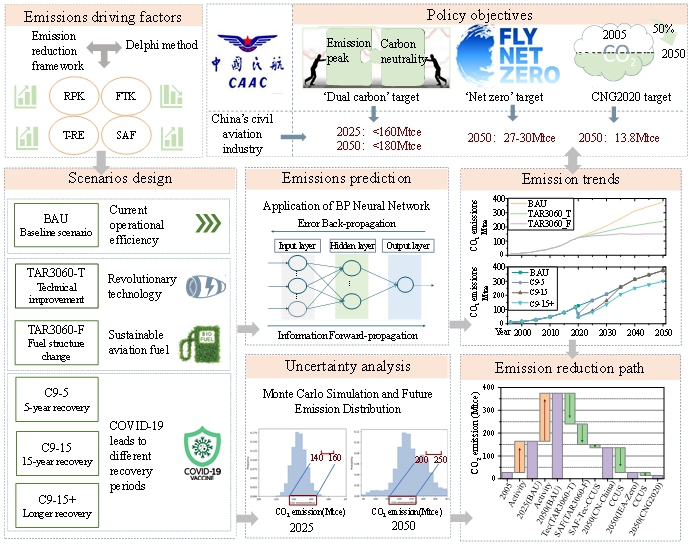 为了减缓国际民航业的碳减排压力,需充分考量影响碳排放的不确定性因素如后疫情时期的运输需求等,才能准确量化其碳排放路径,厘清该路径与减排目标间的差距,针对性地提出减排措施。因此,本研究采用德尔菲法围绕“飞机制造商—航空公司—机场”三方专家多轮调查确定民航业碳排放的关键影响因素,并设定多种发展情景,构建反向传播神经网络与蒙特卡洛模拟模型对中国民航业碳排放路径进行不确定性量化。研究结果表明,中国民航业可以有效帮助中国实现碳达峰和碳中和目标,但是为了实现全球民航业的净零碳排放目标,中国需要在最佳排放情景基础上减少约82%至91%的排放量。因此,在国际净零排放目标下,中国民航业面临较大减排压力。使用可持续航空燃料是到2050年减少航空碳排放的最佳途径。除了应用可持续航空燃料外,还需要开发新一代飞机,引入新材料和升级发动机技术,实施额外的碳吸收措施,并利用碳交易市场,促进中国民航业为减缓气候变化做出贡献(Graphic Abstract如下图所示)。