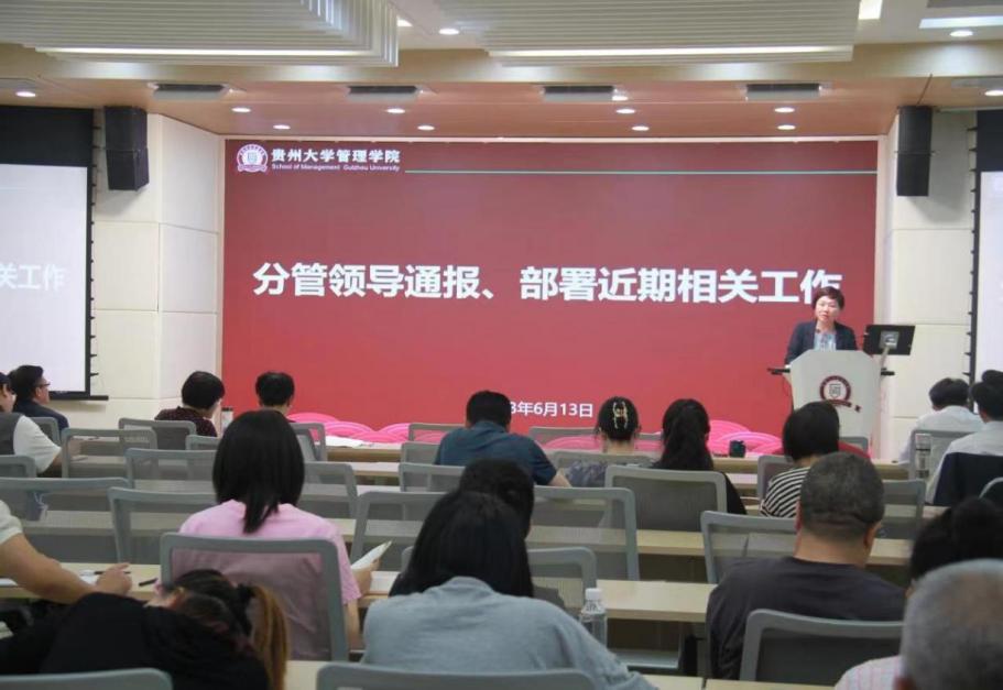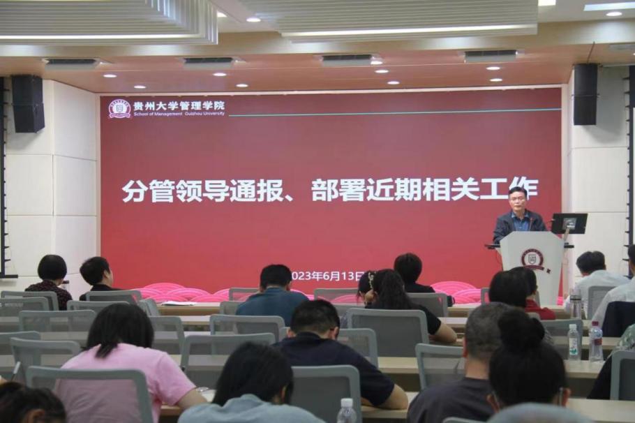 2023年6月13日中午,管理学院在致远楼三楼报告厅组织召开全体教职工大会暨政治学习。管理学院领导班子出席会议,全体教职工参加会议。会议由管理学院院长李烨主持。