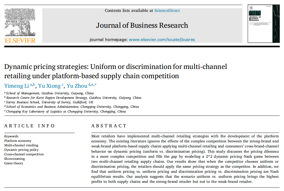 近日,我院教师李义猛的最新研究成果《Dynamic pricing strategies: Uniform or discrimination for multi-channel retailing under platform-based supply chain competition》在国际知名期刊《Journal of Business Research》上在线发表。李义猛博士为论文第一作者,贵州大学管理学院为第一署名单位。