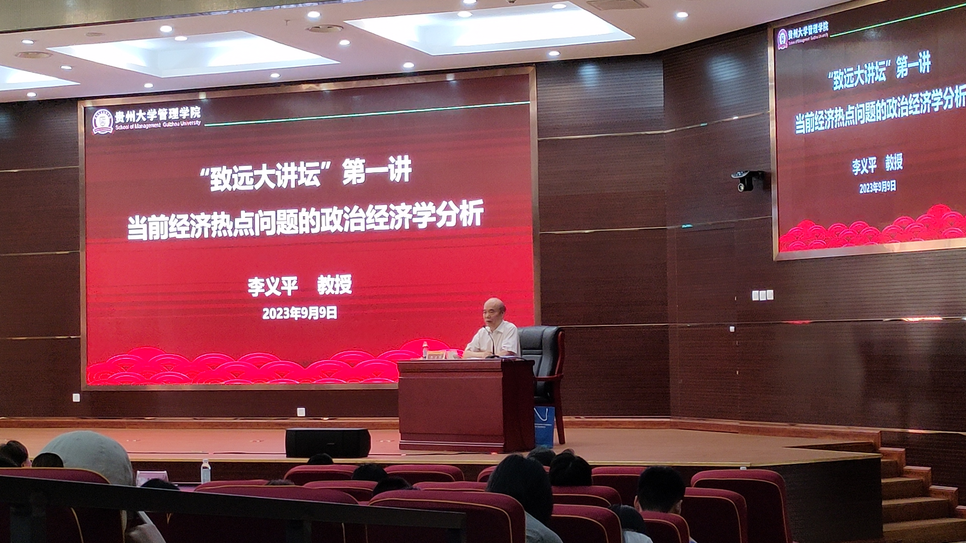 随后,由贵州大学党委委员、管理学院院长李烨主持“致远大讲坛”第一讲。本次讲座的主讲人李义平教授,是北京大学第一位经济学博士后,中国人民大学经济学教授、博士生导师(人大名师)。中国人民大学全国中国特色社会主义政治经济学研究中心学术委员会委员、中国人民大学习近平新时代中国特色社会主义思想研究院校内特约研究员、中央国家机关“学经典、作表率”《资本论》导读老师、中组部中国延安干部管理学院特聘教授。