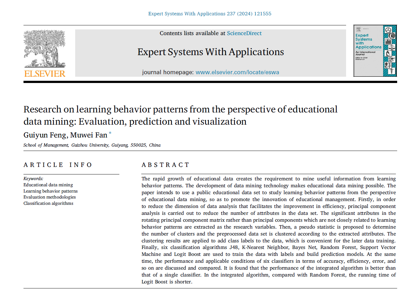 贵州大学管理学院管理科学与工程系硕士研究生冯桂云,教师范慕炜博士(通讯作者)在Expert Systems with Applications期刊(中科院一区顶刊,IF:8.5)发表文章《Research on learning behavior patterns from the perspective of educational data mining: Evaluation, prediction and visualization》。