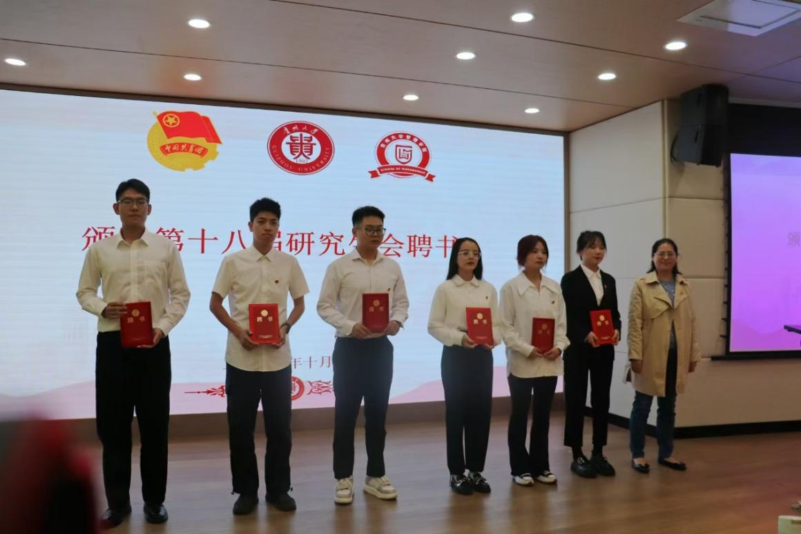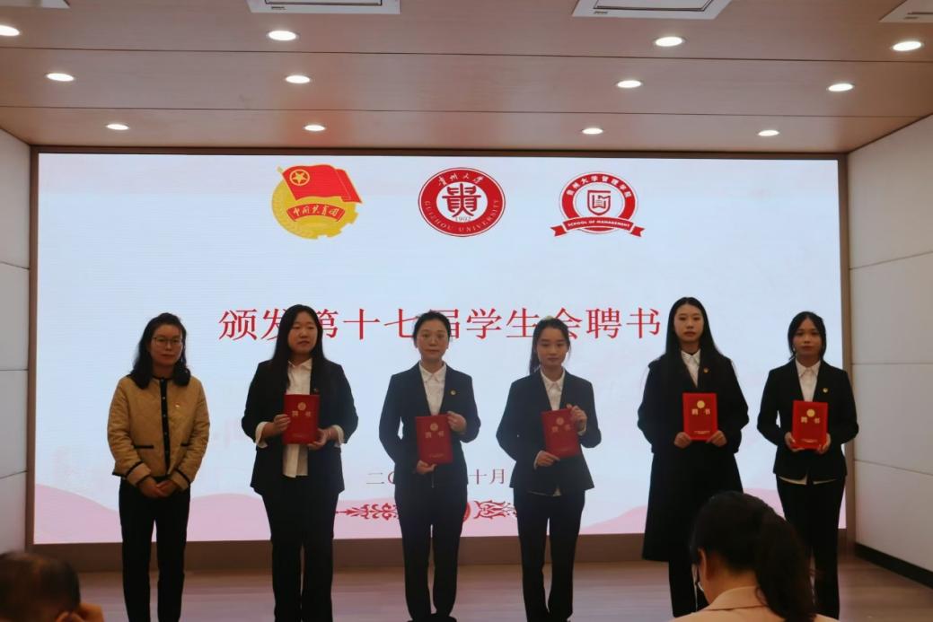 大会第五项,贵州大学团委副书记李媛为第十八届研究生会颁发聘任证书;管理学院党委副书记邓琳为第十七届学生会颁发聘任证书。
