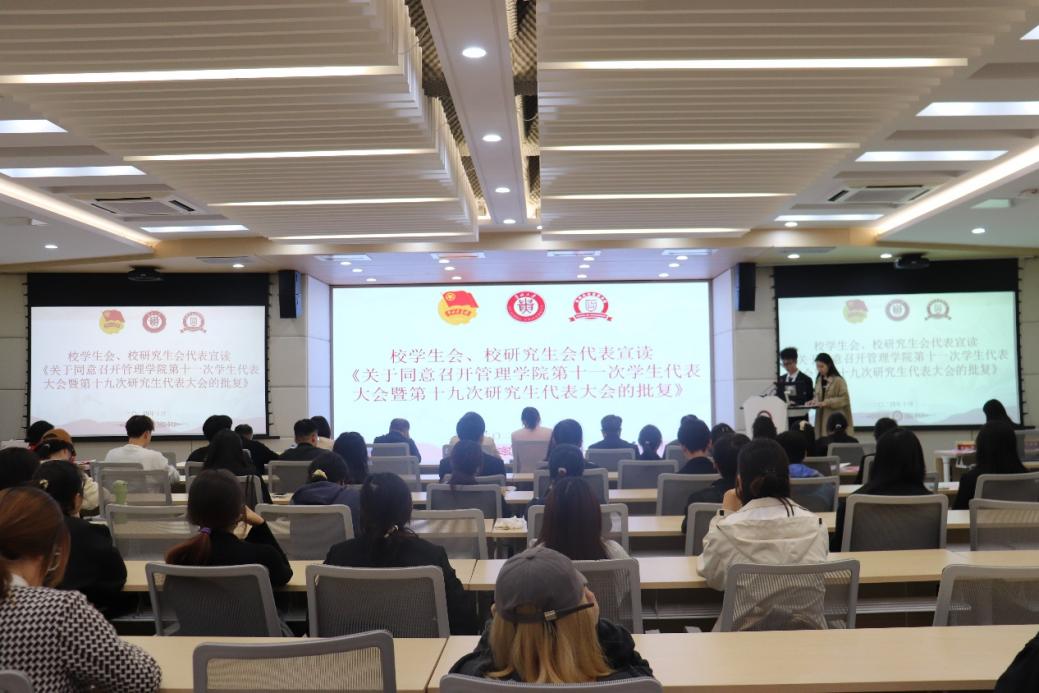 大会第三项,校学生会代表郭颖、研究生会代表张立群宣读《关于贵州大学管理学院第十一次学生代表大会暨第十九次研究生代表大会批复》。