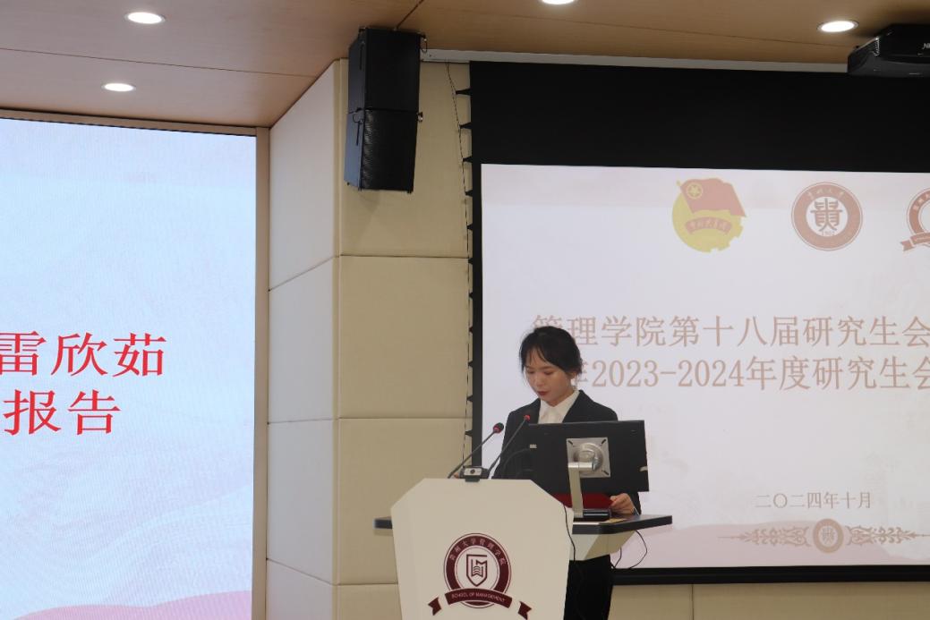管理学院第十八届研究生会主席雷欣茹作2023-2024年度研究生会工作报告。