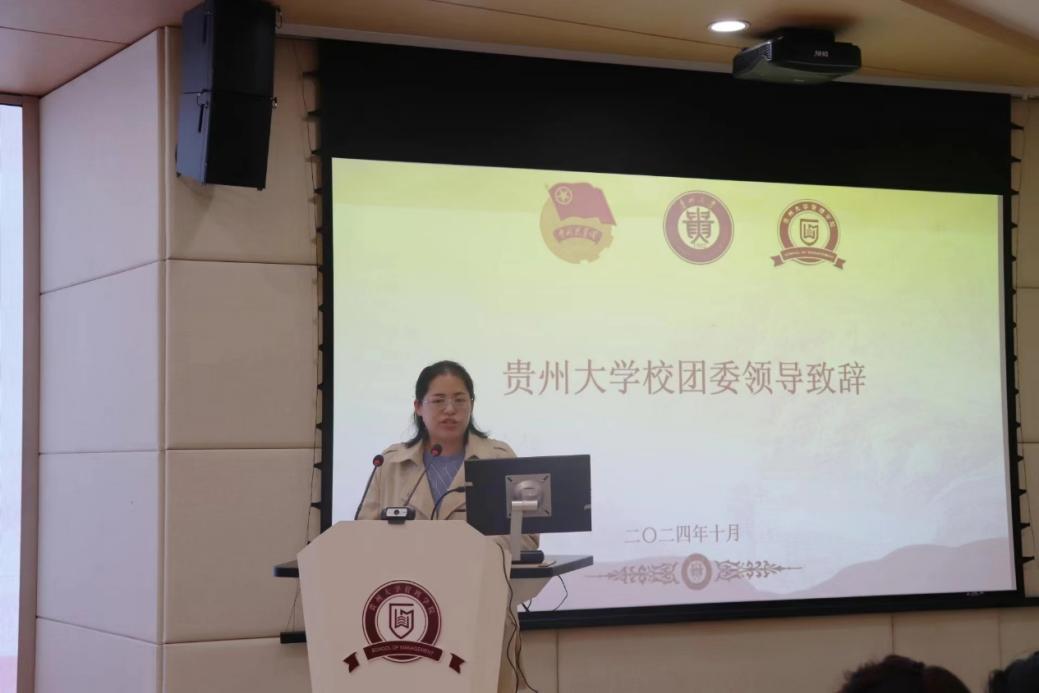 大会第六项,贵州大学团委副书记李媛讲话。她肯定了管理学院团学工作做出的成绩,并强调学生会、研究生会的桥梁和纽带作用,同时勉励管院学子要坚持初心,倾听同学们的意见和建议,坚持从同学中来、到同学中去,主动想同学之所想、急同学之所急,解同学之所需,为同学们提供更好的服务。