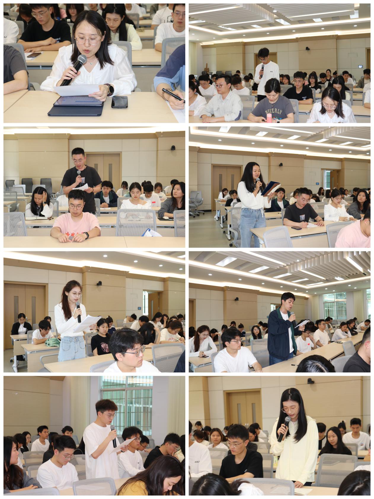 与会师生交流发言。首先是青年教师代表李孟燃,她提到青年应脚踏实地,珍惜在校时光,努力学习,储备知识,培养思维,将个人理想与国家理想相结合,积极参与学科竞赛和学术研究,在实践中磨砺自己,到国家最需要的地方施展才华。其次由七位学生代表进行交流发言,结合自身情况分别发表个人的学习感想体会。